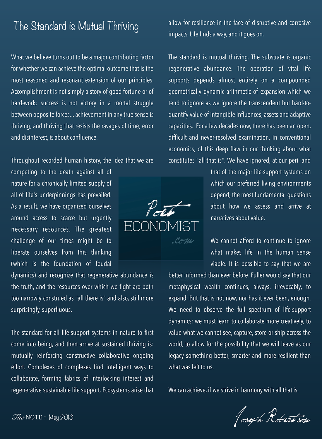 The substrate is organic regenerative abundance. The operation of vital life supports depends almost entirely on a compounded geometrically dynamic arithmetic of expansion which we tend to ignore as we ignore the transcendent but hard-to-quantify value of intangible influences, assets and adaptive capacities. For a few decades now, there has been an open, difficult and never-resolved examination, in conventional economics, of this deep flaw in our thinking about what constitutes “all that is”. We have ignored, at our peril and that of the major life-support systems on which our preferred living environments depend, the most fundamental questions about how we assess and arrive at narratives about value.