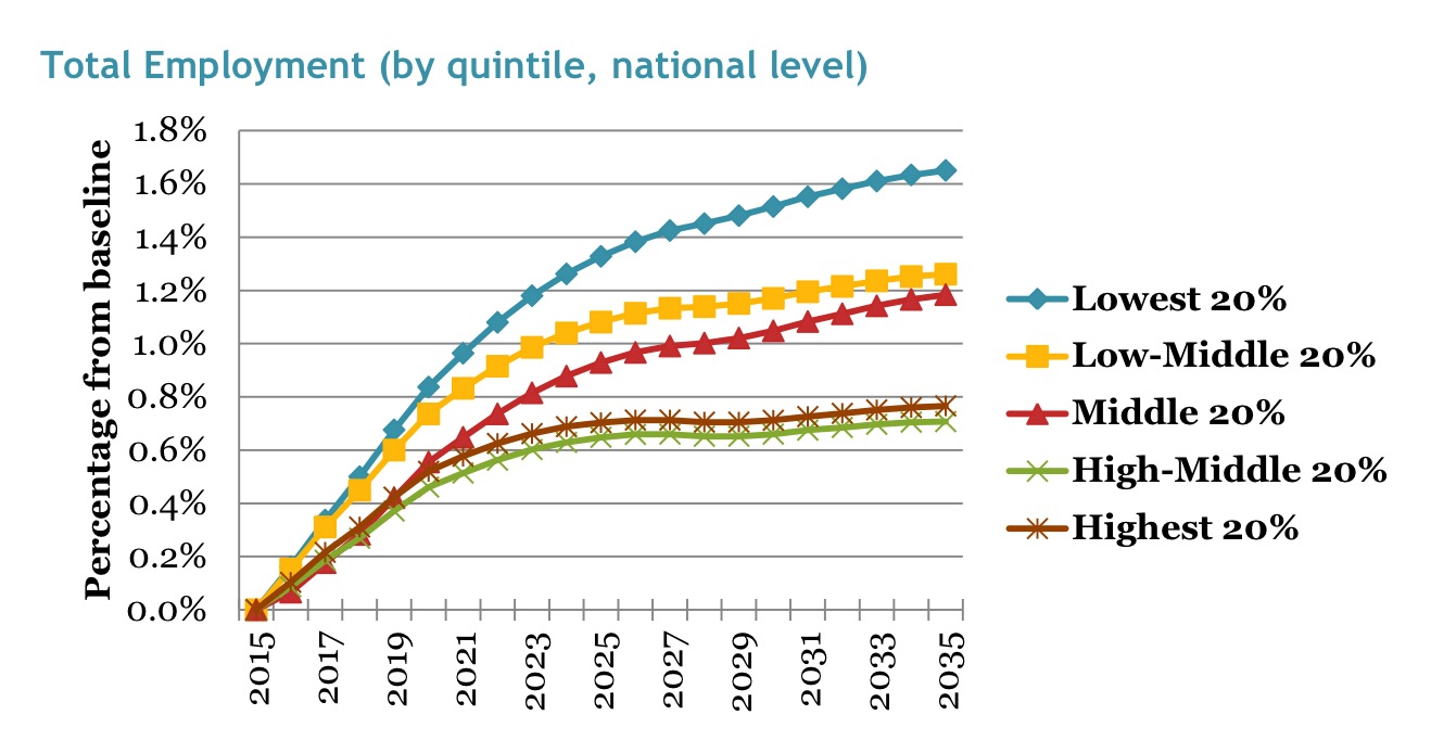 And yet within these strict constraints, the study shows total US emissions of carbon dioxide (CO2) would decline by 33% after just 10 years and by 52% after 20 years. In that 20 year period, total national employment increases by 2.8 million over and above projected economic expansion in the baseline scenario. This is more than a 1% increase in total US employment we don’t get without a carbon fee.