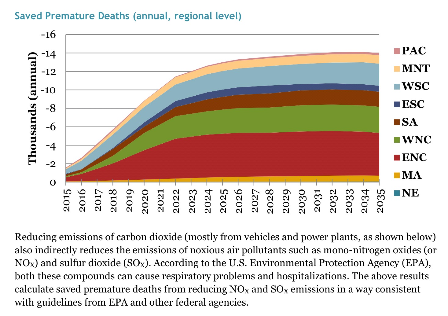 Since heavy polluting plants being taken offline also generate NOx and SOx emissions, which result in high incidence of asthma and lung disease, there is a significant measurable improvement in air quality. In all, REMI shows 13,000 lives will be saved annually after 10 years, with a total of 227,000 American lives saved over just the first 20 years of the plan.