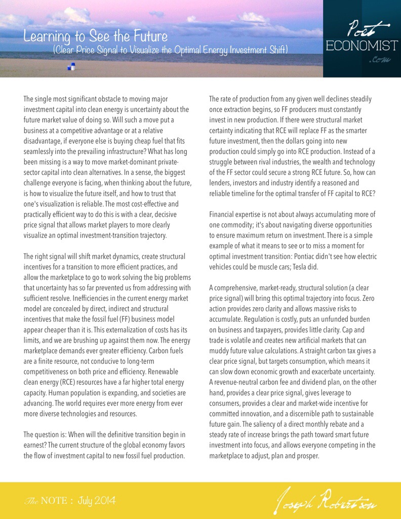 The single most significant obstacle to moving major investment capital into clean energy is uncertainty about the future market value of doing so. Will such a move put a business at a competitive advantage or at a relative disadvantage, if everyone else is buying cheap fuel that fits seamlessly into the prevailing infrastructure? What has long been missing is a way to move market-dominant private-sector capital into clean alternatives. In a sense, the biggest challenge everyone is facing, when thinking about the future, is how to visualize the future itself, and how to trust that one’s visualization is reliable. The most cost-effective and practically efficient way to do this is with a clear, decisive price signal that allows market players to more clearly visualize an optimal investment-transition trajectory.