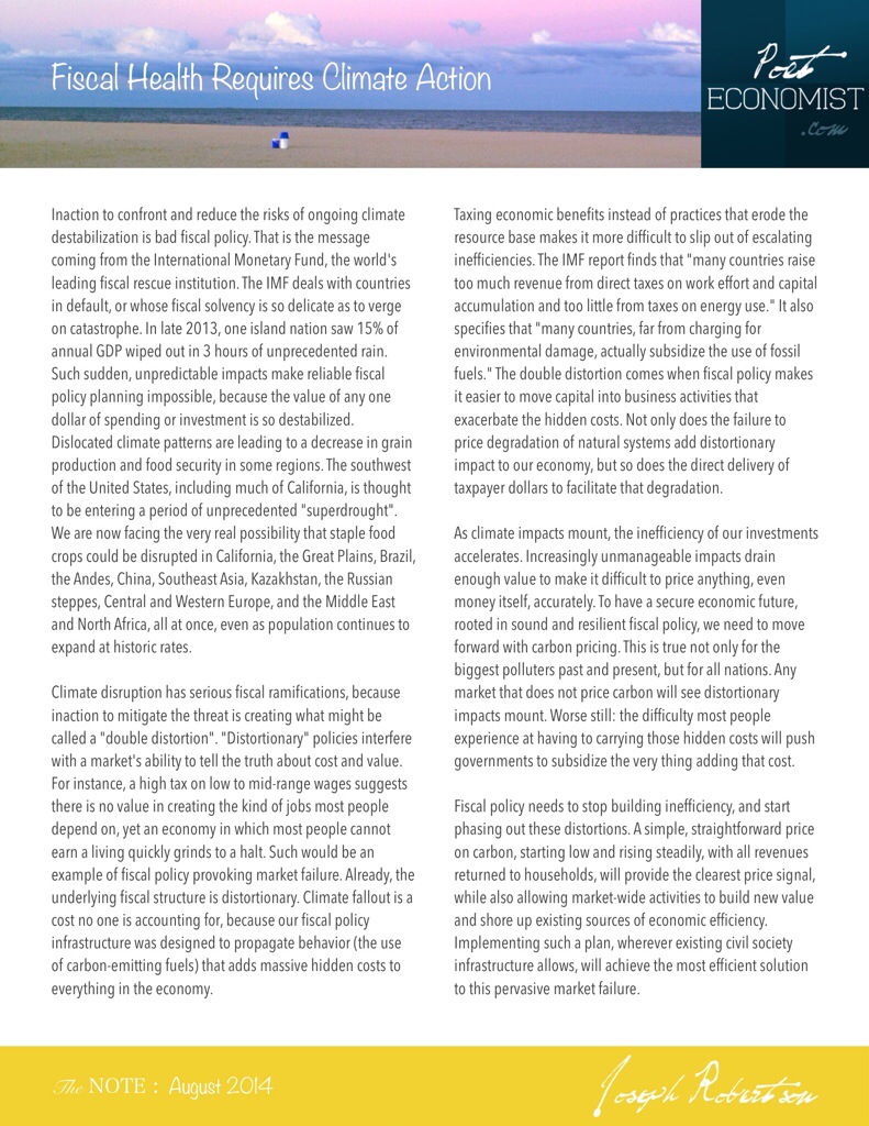 Inaction to confront and reduce the risks of ongoing climate destabilization is bad fiscal policy. That is the message coming from the International Monetary Fund, the world’s leading fiscal rescue institution. The IMF deals with countries in default, or whose fiscal solvency is so delicate as to verge on catastrophe. In late 2013, one island nation saw 15% of annual GDP wiped out in 3 hours of unprecedented rain. Such sudden, unpredictable impacts make reliable fiscal policy planning impossible, because the value of any one dollar of spending or investment is so destabilized.