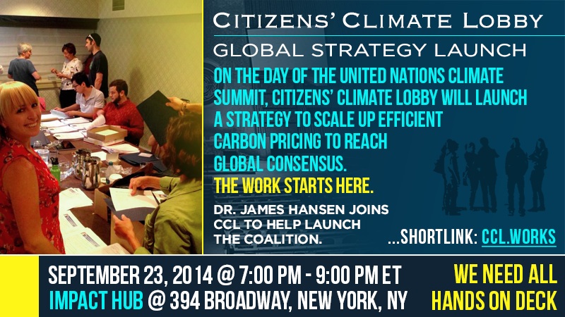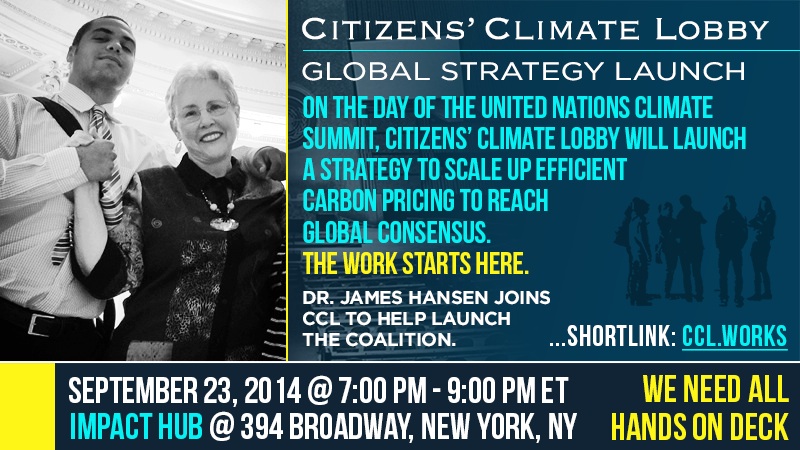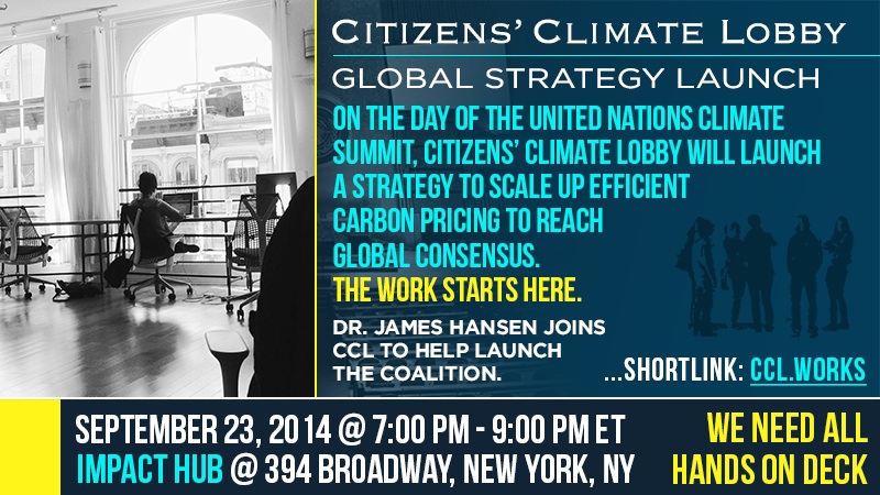 On the day of the UN Climate Summit, Sept. 23, 2014, Citizens’ Climate Lobby released its fully annotated Global Strategy Whitepaper, and launching its effort to pull together a coalition of stakeholders, thought-leaders, businesses, nonprofits and governments, to achieve an economically efficient, value-building plan to price carbon and transition to climate-smart economic and investment policies.