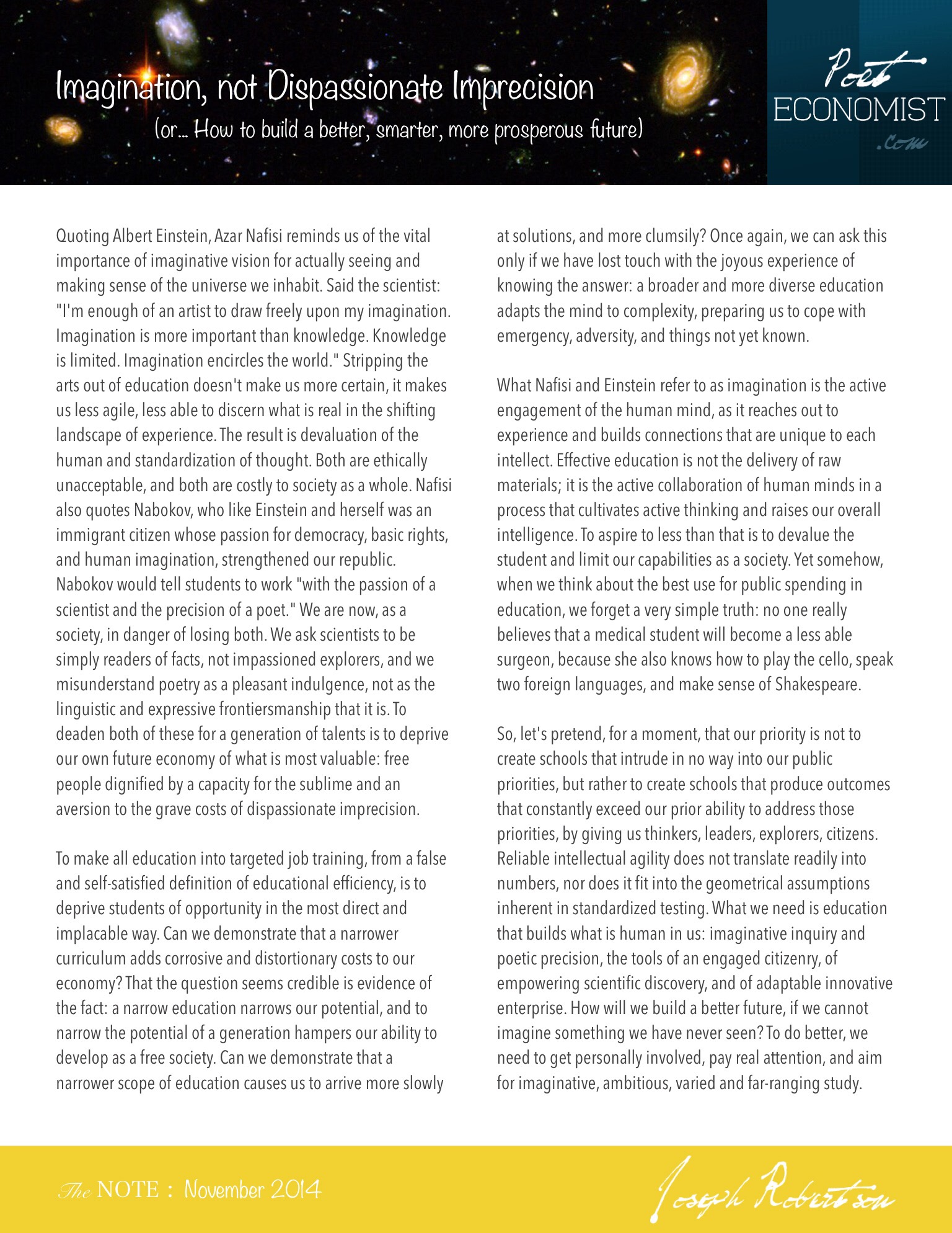 Quoting Albert Einstein, Azar Nafisi reminds us of the vital importance of imaginative vision for actually seeing and making sense of the universe we inhabit. Said the scientist: “I’m enough of an artist to draw freely upon my imagination. Imagination is more important than knowledge. Knowledge is limited. Imagination encircles the world.” Stripping the arts out of education doesn’t make us more certain, it makes us less agile, less able to discern what is real in the shifting landscape of experience. The result is devaluation of the human and standardization of thought. Both are ethically unacceptable, and both are costly to society as a whole. Nafisi also quotes Nabokov, who like Einstein and herself was an immigrant citizen whose passion for democracy, basic rights, and human imagination, strengthened our republic. Nabokov would tell students to work “with the passion of a scientist and the precision of a poet.” We are now, as a society, in danger of losing both. We ask scientists to be simply readers of facts, not impassioned explorers, and we misunderstand poetry as a pleasant indulgence, not as the linguistic and expressive frontiersmanship that it is. To deaden both of these for a generation of talents is to deprive our own future economy of what is most valuable: free people dignified by a capacity for the sublime and an aversion to the grave costs of dispassionate imprecision.
