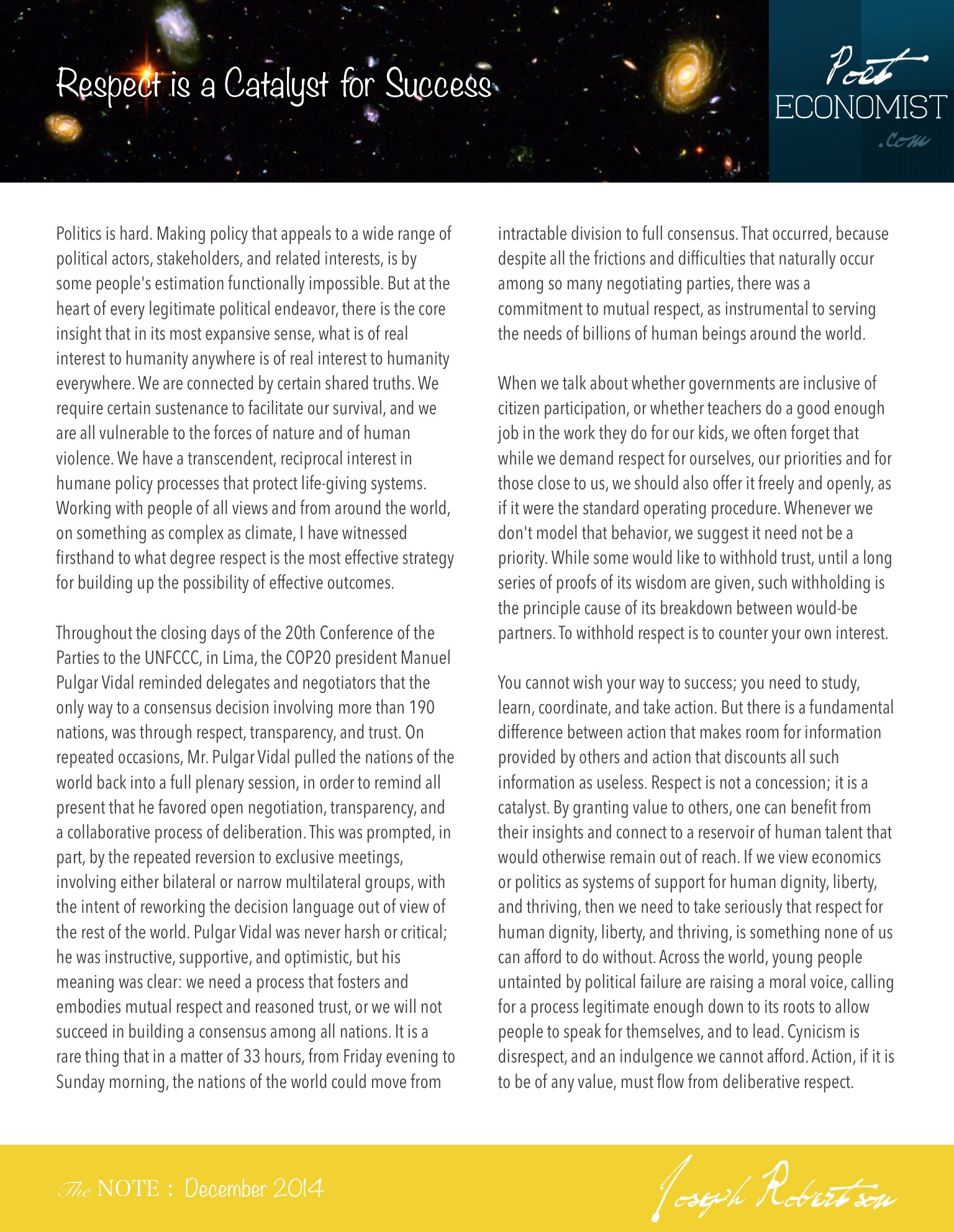 Throughout the closing days of the 20th Conference of the Parties to the UNFCCC, in Lima, the COP20 president Manuel Pulgar Vidal reminded delegates and negotiators that the only way to a consensus decision involving more than 190 nations, was through respect, transparency, and trust. On repeated occasions, Mr. Pulgar Vidal pulled the nations of the world back into a full plenary session, in order to remind all present that he favored open negotiation, transparency, and a collaborative process of deliberation. This was prompted, in part, by the repeated reversion to exclusive meetings, involving either bilateral or narrow multilateral groups, with the intent of reworking the decision language out of view of the rest of the world. Pulgar Vidal was never harsh or critical; he was instructive, supportive, and optimistic, but his meaning was clear: we need a process that fosters and embodies mutual respect and reasoned trust, or we will not succeed in building a consensus among all nations. It is a rare thing that in a matter of 33 hours, from Friday evening to Sunday morning, the nations of the world could move from intractable division to full consensus. That occurred, because despite all the frictions and difficulties that naturally occur among so many negotiating parties, there was a commitment to mutual respect, as instrumental to serving the needs of billions of human beings around the world.