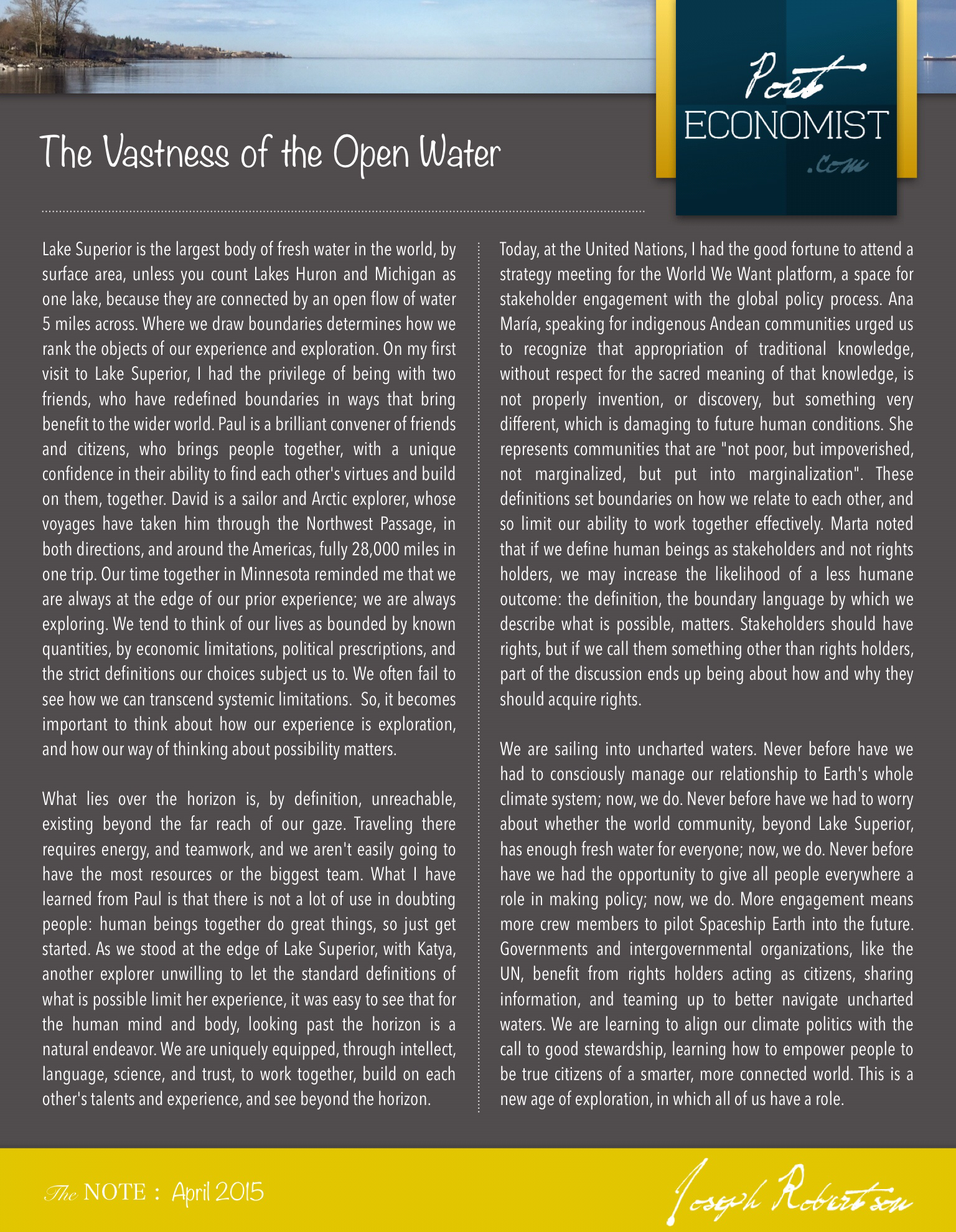We are sailing into uncharted waters. Never before have we had to consciously manage our relationship to Earth’s whole climate system; now, we do. Never before have we had to worry about whether the world community, beyond Lake Superior, has enough fresh water for everyone; now, we do. Never before have we had the opportunity to give all people everywhere a role in making policy; now, we do. More engagement means more crew members to pilot Spaceship Earth into the future. Governments and intergovernmental organizations, like the UN, benefit from rights holders acting as citizens, sharing information, and teaming up to better navigate uncharted waters. We are learning to align our climate politics with the call to good stewardship, learning how to empower people to be true citizens of a smarter, more connected world. This is a new age of exploration, in which all of us have a role.