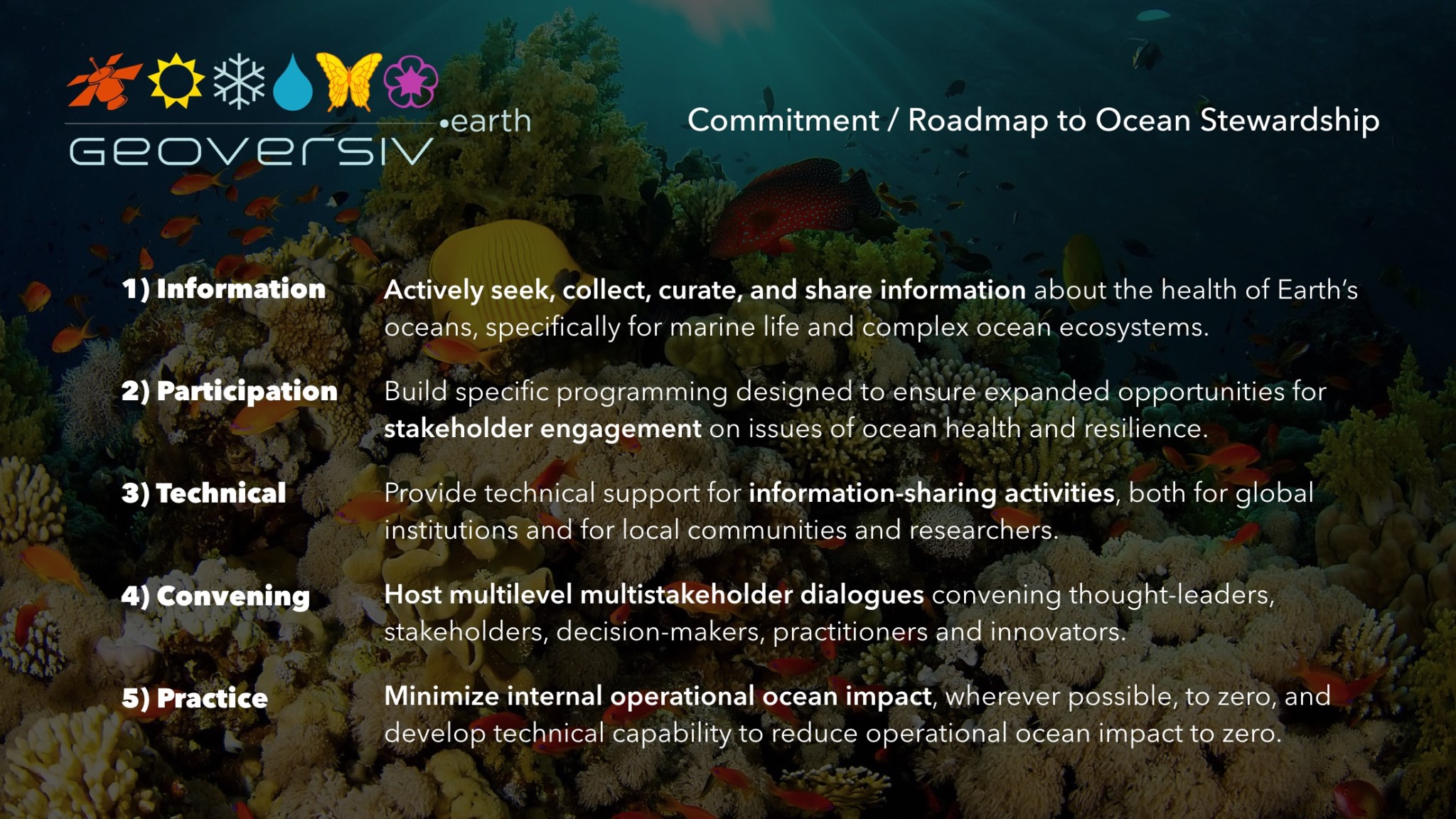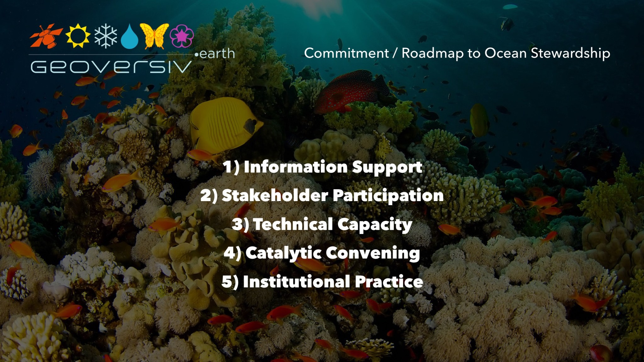 The Geoversiv Commitment to Ocean Stewardship is intended as both an institutional action agenda and a process of exploration and discovery, generating roadmaps for others to follow. It operates through five areas of action: