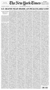 The New York Times gave its front page yesterday to 1,000 names of those lost to COVID-19. The image is startling, and sobering. More sobering still: it would take 99 more such pages to provide enough space for the names of all of those lost so far. Online, the Times has created an interactive article that provides short, but highly personal excerpts from obituaries about the people lost to the virus.